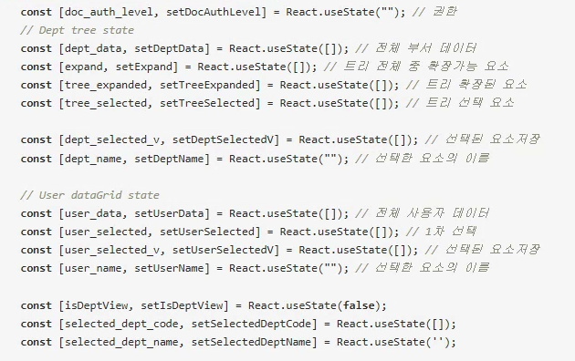 OcrMain.js 페이지는 컨테이너 컴포넌트로 문서가 속해 있는 그룹, 페이지, 수정에 관한 정보들을 상태값으로 관리합니다. 여기서는 상태의 세세한 정의 보다는 useReducer 사용 전후를 비교하여 간단하게 사용법에 대한 이해를 돕도록 하겠습니다.